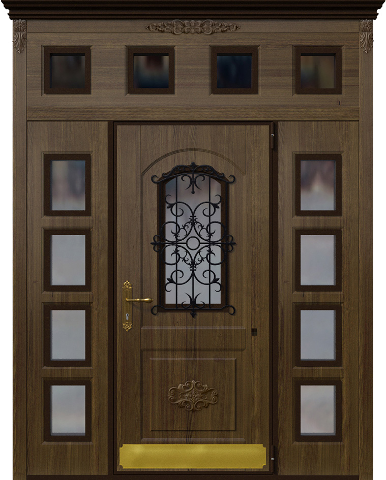 Эта модель выделяется своим масштабом и декоративностью: двухстворчатая дверь со вставками и ковкой №2 подчеркивает парадность входа и придает фасаду респектабельность. Основу составляет прочный каркас из стальных профильных труб с листом металла толщиной 2 мм и ребрами жесткости, что обеспечивает долговечность и защиту. Снаружи и внутри полотно облицовано накладками МДФ, которые позволяют воплотить различные варианты текстур и оттенков, сохраняя устойчивость к механическим повреждениям и влиянию внешней среды. Кованые элементы вносят в образ двери нотку изысканности и индивидуальности, делая ее центральным акцентом всего фасада. Для безопасности предусмотрены два замка турецкого производителя Kale Kilit — цилиндровый и сувальдный, каждый с ригелями, усиливающими защиту. Такая дверь сочетает надежность металлической конструкции с эстетикой классического дизайна, превращая вход в настоящий архитектурный акцент. Двухстворчатая дверь со вставками и ковкой №2 от производителя: быстрое изготовление и монтаж в Чехове, индивидуальные размеры, широкий выбор материалов и фурнитуры, официальная гарантия до 10 лет.